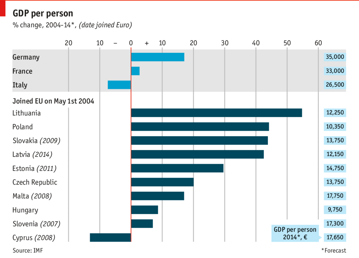 Среди этих стран есть четыре явных победителя. Два прибалтийских страны – Литва и Латвия, а также Польша вместе со Словакией, где ВВП на душу населения вырос на 40%. Рост балтийских экономик (включая рост в Эстонии на 30%) особенно заметен; все три экономики столкнулись с тяжелым спадом в 2009 году после финансового кризиса. Был среди этих стран также один проигравший. Киприоты фактически стали беднее на 13% с 2004 года. Словения, столкнувшаяся с большим банковским кризисом (хотя и не с таким большим, как Кипр), также чувствовала себя плохо, рост ВВП в этой стране составил лишь 7%.