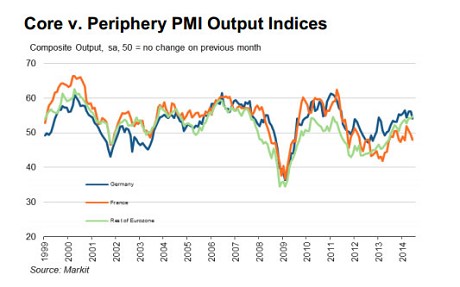 Эти страны должны выступать в роли тяжеловесов Европы, однако последние данные показывают, что ядро еврозоны работает «со сбоями», тогда как в остальной части еврозоны рост оказался на максимальных докризисных уровнях. По последним данным индекса менеджеров по закупкам Markit, французская экономика пострадала от резкого спада, немецкая из-за минимальных темпов роста за восемь месяцев.