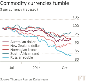 Стоимость Brent потеряла более пятой части стоимости с начала года, железная руда снизилась примерно на 40%, цены на некоторую молочную продукцию снизились на треть, валюты других крупных сырьевых экспортеров также пострадали. Австралийский и новозеландский доллары, которые славились упрямо высокими курсами последние годы, несмотря на попытки политиков снизить их, наконец, начали отражать снижение торговых условий, потеряв около 6.5% и 8% соответственно против американского доллара в течение трех месяцев.