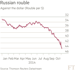 Центральный Банк России заявил о свободном плавании рубля в среду, что вызвало дальнейшее снижение валюты, тогда как задачей такого решения была стабилизация курса. Пострадав из-за снижения стоимости нефти, а также западных санкций, рубль потерял более четверти своей стоимости против доллара с начала года. Интервенции ЦБ замедлили падение (в октябре их объем составил 29 миллиардов долларов), вместе с этим вымывая валютные резервы страны.