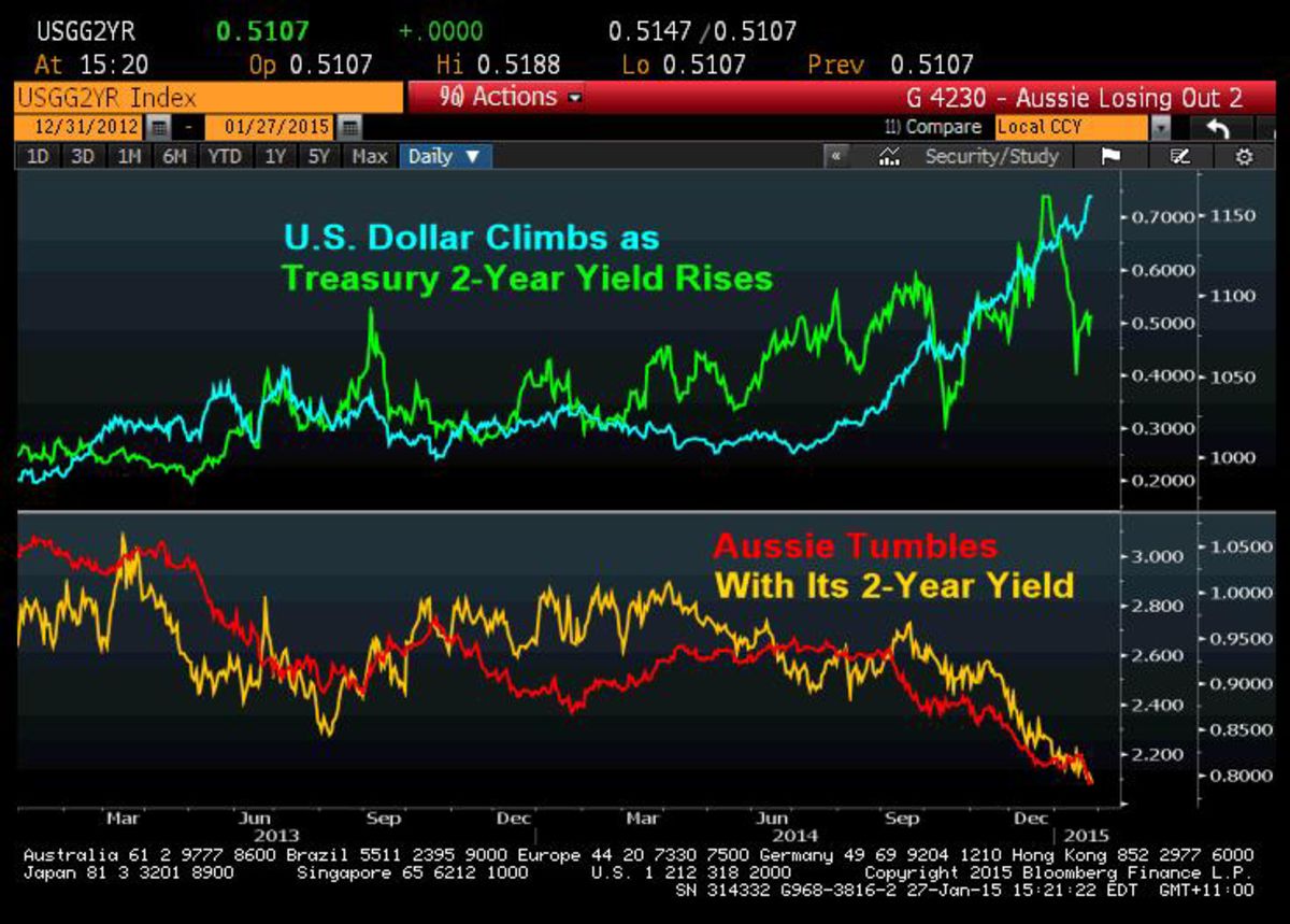 Осси снизился на 16% за последние шесть месяцев до минимального уровня с 2009 года, председатель РБА Гленн Стивенс заявил, что ожидает продолжения снижения. Осси падал меньше, чем евро и валюты Дании, Канады, Норвегии в этом году, так что он будет следующим в цепочке домино", - заявил Оливер Корбер, стратег Societe Generale SA в Париже. Австралия пострадала из-за окончания сырьевого бума и замедления в Китае, на который приходятся более 35% экспорта в этом регионе. Индекс сырьевых цен Deutsche Bank AG снизился на 30% в течение последних 12 месяцев на фоне падения цен на железную руду и энергетический уголь.