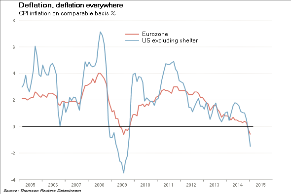 Тем не менее, этот график должен предложить пищу для размышлений: он показывает, что американская инфляция находится на той же основе, что в еврозоне, которая опасается "плохой" инфляции. Еврозона не включает стоимость содержания жилья в корзину потребительских цен, так что в этом сравнении из американских данных также исключена стоимость содержания жилья. График на этой основе не кажется лучше с дефляцией даже большей, чем в Европе.