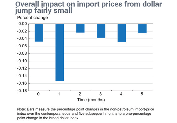 Исследователи сосредоточились на не нефтяном импорте. Они пришли к выводу, что рост курса доллара на 1% снижает цены не нефтяной импорт на 0.3% в совокупности в течение шести месяцев. С минимума в начале июля по конец декабря доллар вырос на 9% против корзины валют. За тот же период не нефтяные цены на импорт падали лишь на 1.3%. Оценка влияния на потребительские цены сложнее, частично из-за того, что она зависит от причин роста доллара.