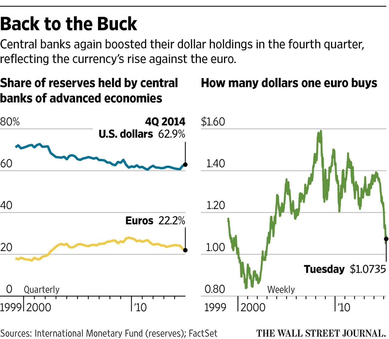 В первом квартале доллар продемонстрировал крупнейший квартальный прирост на 13% против евро со времен введения единой валюты в 1999 году. Американский доллар торгуется на уровне 12-ти летнего максимума против евро. Вечером во вторник в Нью-Йорке евро покупался за $1.0735 в сравнении с $1.0834 в понедельник. Центральные банки вкладывались в евро в течение многих лет с момента запуска, заставляя некоторых обозревателей задаться вопросом в отношении возможности для евро заменить доллар в качестве глобальной резервной валюты. Доля евро в глобальных валютных резервах достигла максимума около 28% в третьем квартале 2009 года.