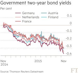 Дания продавала государственный трехлетний долг на 3.6 миллиарда крон с средней доходностью -0.31%, Швеция предлагала трехмесячныее долги на 15 миллиардов крон с доходностью -0.42%. Шведские двухлетние ценные бумаги торговались с доходностью -0.47%, находясь в положительной территории в январе, тогда как датские были на уровне -0.70%. Если ЕЦБ сохраняет или расширяет программу количественного смягчения в декабре, чего многие и ожидают, спрос на госдолг будет расти, что в свою очередь толкнет цены вверх. Тот факт, что инвесторы хотят покупать госдолг с отрицательной доходностью - это признак уверенности в том, что Драги сделает ожидаемое заявление на заседании ЦБ в следующем месяце.
