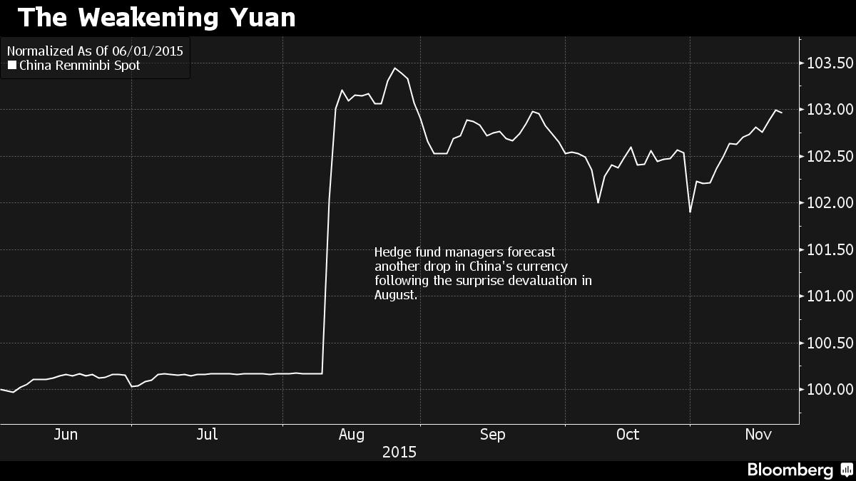 "Сценарий снижения для Китая выглядит еще более устрашающе, чем когда-либо, - писал миллиардер Дан Лойб 30 октября в комментариях для клиентов Third Point, под управлением которой находятся 18 миллиардов долларов. - Сейчас вопрос ставится так: не когда это произойдет, а насколько тяжелым может быть снижение наиболее внушительной глобальной машины роста". В четверг Goldman Sachs Group Inc. также выразил солидарность с опасениями инвесторов, заявив, что наиболее существенным риском для восстановления активов развивающегося рынка в следующем году будет "существенная девальвация" юаня. Политики, сталкивающиеся с ростом доллара и замедлением роста, могут позволить валюте снижаться, что пойдет волной по всем развивающимся рынкам, писали стратеги во главе с Камакши Триведи.