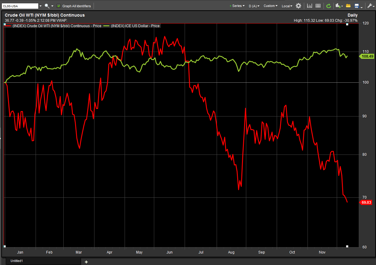 Рост американского доллара и прогнозы на дальнейшее укрепление по мере приближения заседания ФРС также сыграли свою роль в снижении нефти. С момента принятия решения ОПЕК о сохранении добычи на неизменном уровне, падение стоимости нефти можно отнести больше с укреплению доллара, чем к "перенасыщению рынка".