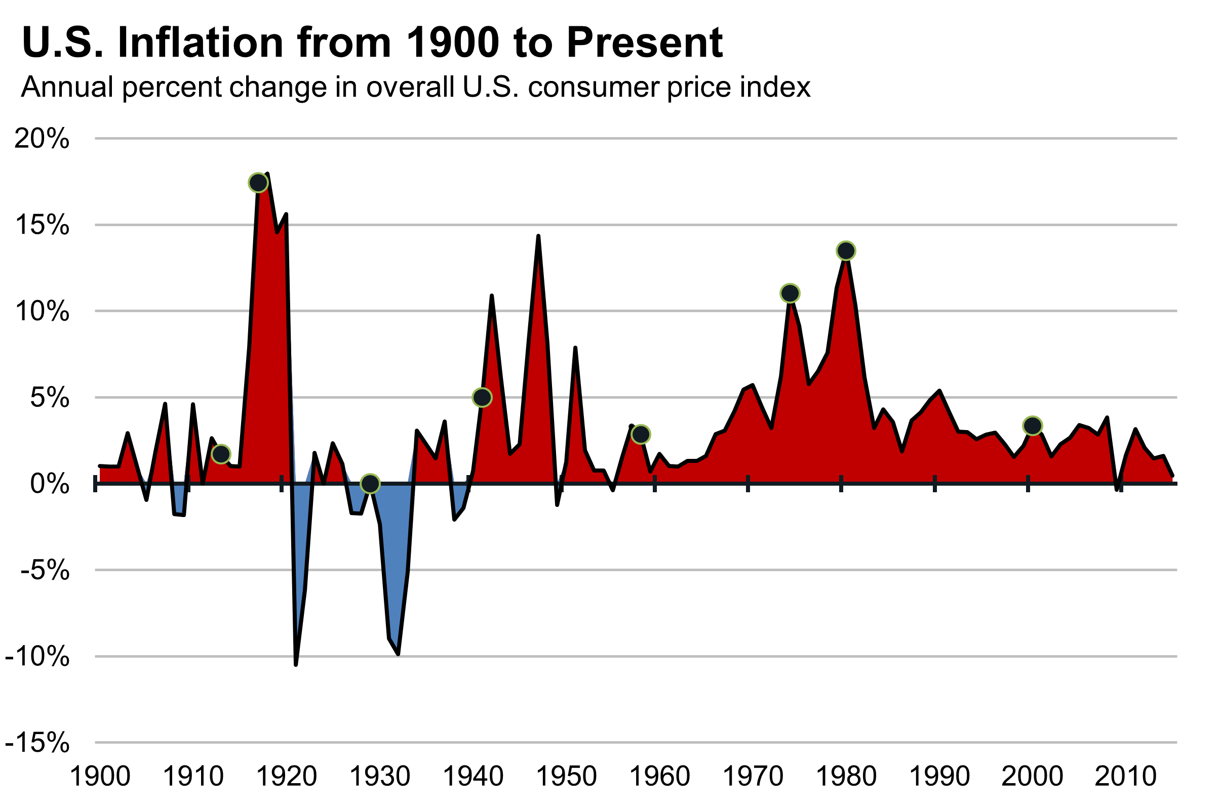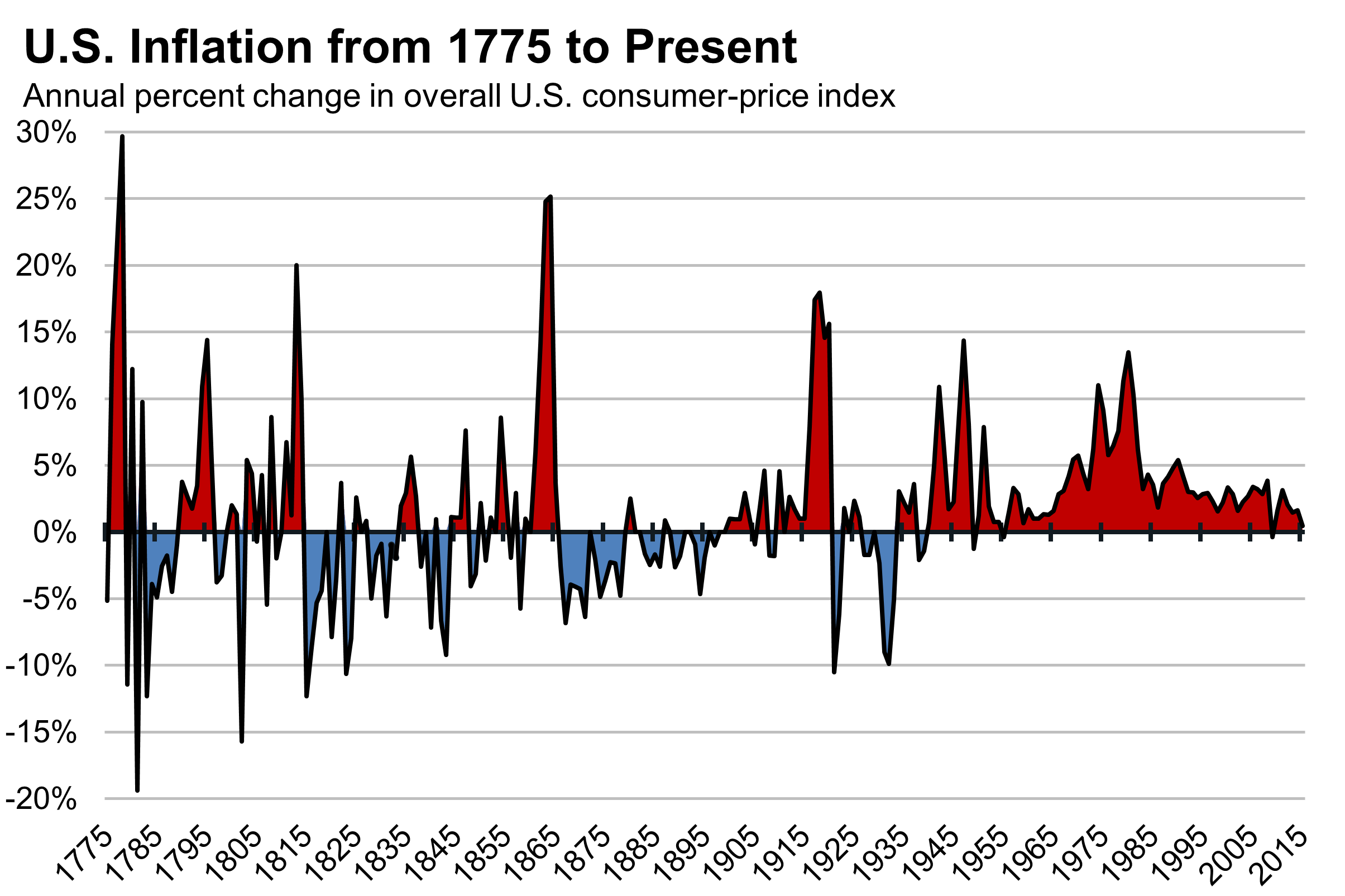 За последние 240 лет уровень инфляции был либо значительно выше, либо значительно ниже, чем сегодня. Что действительно изменилось, так это понимание экономистов причин роста цен. Со времен Войны за независимость США до Второй Мировой Войны инфляция демонстрировала значительно более резкую динамику, нежели сегодня. Цены особенно сильно колеблются в периоды войн, следом идут длинные периоды дефляции. В течение длительных периодов времени этим драматичные колебания, как правило, находят точку равновесия, но она далека от того, что сегодня считается "ценовой стабильностью".