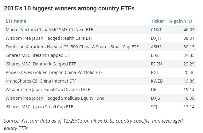 Даже на фоне существенного роста в 2015 году эти фонды не привлекали столь существенных инвесторских денег, в каждом менее чем по 200 миллионов долларов активов под управлением, по данным EFT.com. Япония также демонстрирует хорошую динамику. WisdomTree Japan Hedged Health Care ETF на второй позиции в списке с ростом на 38% в 2015 году, другие японские фонды заняли последние три места в топе 10. В целом, Китай кажется наиболее привлекательной страной для инвесторов в 2015 году, по крайней мере, если судить по этому списку. Здесь не учитывается целый ряд проблем, например, волатильность, которую инвесторы пережили в 2015 году или слабые рейтинги страны по статье ведения бизнеса.