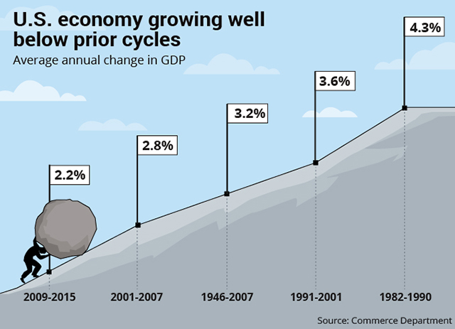 Если эти прогнозы сбудутся, экономика покажет лучшую производительность за 10 лет. США росли на 2.7% в 2006 году за год до начала рецессии. Лидеры бизнеса, научных кругов и представители экономического консалтинга едины во мнении. Национальная ассоциация экономистов в области частного предпринимательства ожидает роста на 2.6% в 2016 году. Таких же показателей ожидают и профессиональные аналитики ФРС Филадельфии. Аналогичный опрос ФРС Чикаго профессоров, консультантов и исполнительных директоров дает такой же прогноз на 2.6%.