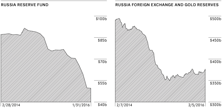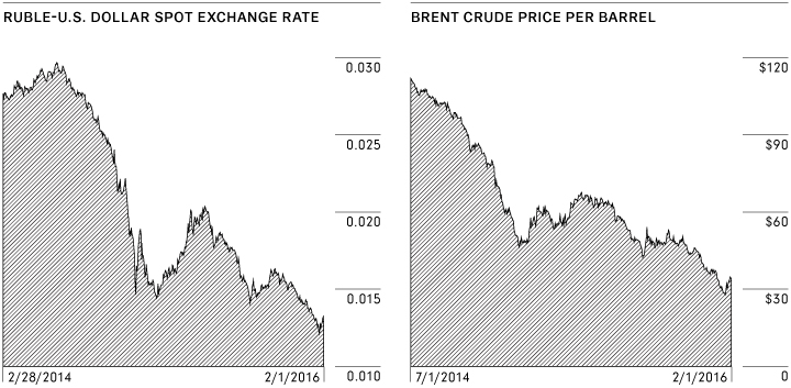 Когда Путин пришел к власти в 2000 году нефть торговалась в среднем на $28.44 за баррель. В течение следующих восьми лет нефтяные доходы росли, рост ВВП в среднем составлял 7%. В ходе ежегодных пресс-конференций Путин обычно чувствует себя весьма комфортно, отвечая на безобидные вопросы в течение некоторого времени. На конференции 17 декабря журналисты даже государственных СМИ задавали неудобные вопросы по ситуации в экономике. Следующие выборы президента, которые, как ожидается, Путин снова выиграет, оказывают давление на госрасходы, которые нужно сокращать, так как они могут окончательно истощить резервные фонды России в течение года-двух, в настоящий момент они составляют около $120 млрд. Российский ВВП сократился на 3.7% в прошлом году и может потерять еще 3% в 2016, если цена на нефть будет составлять в среднем $35. В январе рубль достиг нового дна - на 60% ниже уровня середины 2014 года. В то время как некоторые российские и корпоративные облигации "привлекательны", большинство же инвесторов сейчас продают все, что связано с нефтью, а Россия тут имеет самое прямое отношение.