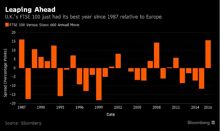 Для британских компаний динамика фунта после Brexit стала подарком. Индекс FTSE 100 закрывался на максимумах каждый день с начала торговли после праздников. Еще один максимум во вторник может стать новым рубежом для эталонного индекса: рекордной восьмидневной чередой роста. Приближаясь к лучшей годовой производительности против Stoxx Europe 600 за 30 лет, FTSE 100 вырос на 1.6% в 2017 году, тогда как дальнейшее снижение фунта придало импульс экспортерам, акции же производителей сырья были в состоянии ралли.