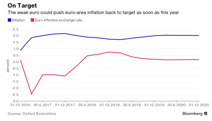 В исследовании Oxford Economics указывается, что по мере снижения евро потенциально к паритету с долларом это будет оказывать более сильнее влияние на внутреннюю инфляцию, нежели прогнозирует ЕЦБ, и это будет не разовым эффектом. Этому есть несколько причин. Во-первых, потребители покупают больше импортных товаров и услуг, чем должны: на 9% больше, чем в 2009 году. Во-вторых, экспортеры в еврозону стали повышать цены из-за высокого спроса. “Недооценка важности динамики обменного курса даст ястребам основания для обсуждения сворачивания текущей политики раньше, чем ожидалось, так как инфляция поползет выше прогнозов чиновников ЕЦБ”.