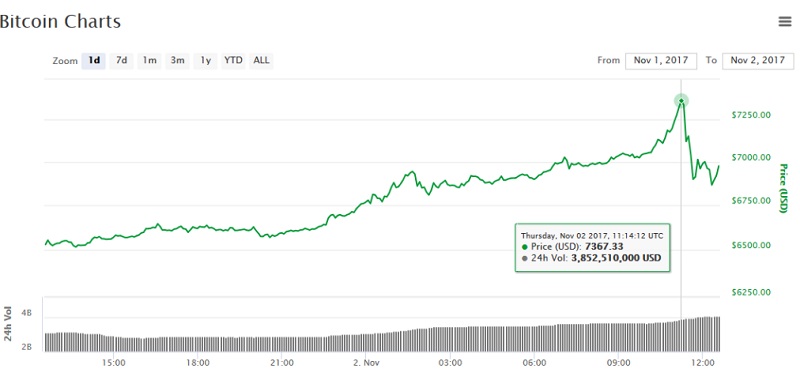 Не будет преувеличением сказать, что биткоин единолично сумел поднять рыночную капитализацию. За последний месяц капитализация рынка увеличилась примерно на $40 млрд., тогда как в общем рынок других криптовалют снижался. Бычью гонку сегодня казалось просто не остановить, оптимизм вокруг решения CME Group о начале торгов фьючерсными контрактами на биткоин толкнуло криптовалюту выше $7,000 до нового исторического максимума на $7,367. Несмотря на обвал на $500 после достижения пика, цена быстро восстановилась до $7,000, и в данный момент эталонная криптовалюта торгуется на $7,061.