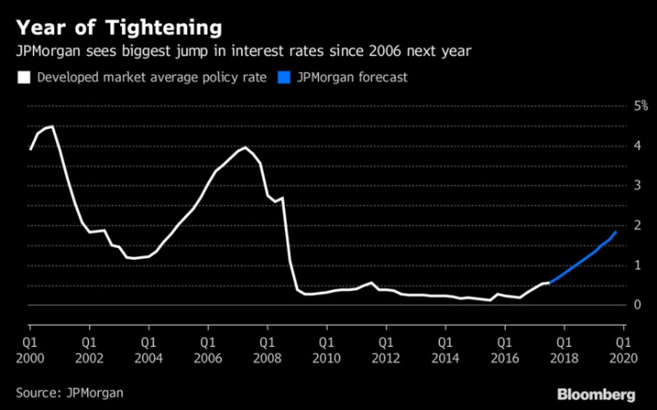 Экономисты с Уолл-Стрит заявляют, что инвесторы замерли в ожидании сильного ужесточения денежно-кредитной политики более чем за десятилетие, так как глобальная экономика демонстрирует наиболее сильные экономические показатели с 2011 года, Citigroup Inc. и JPMorgan Chase & Co. прогнозируют, что в среднем процентные ставки в рамках развитых экономик вырастут, по крайней мере, на 1% следующем году, таким образом, это будет крупнейшее повышение 2006 года. В следующем году будет 10ая годовщина с момента начала программы количественного смягчения в США, Bloomberg Economics прогнозируют что чистые закупки активов крупнейшими центральными банками упадут до $18 млрд. ежемесячно к концу 2018 года со $126 млрд. по состоянию на сентябрь.