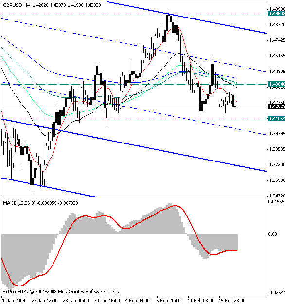 Следует отметить, что у трейдеров сохраняются слабо выраженные медвежьи настроения по данной валютной паре. На это указывают скользящие средние направленные вниз, а так же гистограмма MACD расположенная в отрицательной зоне. Значительный интерес продавцов британского фунта может вызвать пробой уровня поддержки 1.4150. В таком случае дальнейшие возможные цели будут расположены на 1.4100/4080 и 1.4020/00.