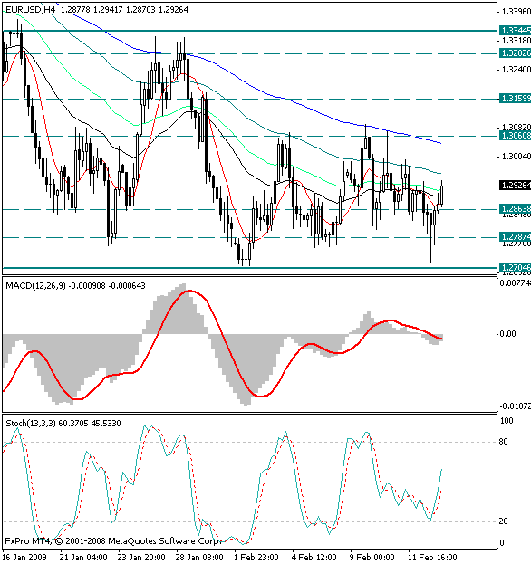 На 4х часовом графике сохраняется ценовой диапазон 1.2700-1.3070, в рамках которого проходят торги второй месяц. Осциллятор стохастик направлен вверх, а гистограмма MACD так же указывает на слабо выраженные бычьи настроения. В то же время скользящие средние 89 и 144 оказывают сопротивления для дальнейшего роста евро.