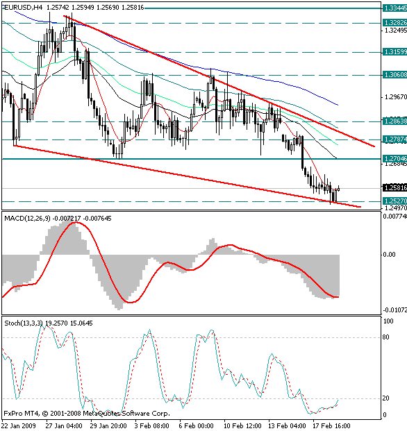 Курс единой европейской валюты по прежнему остается под давлением. Так в ходе торгов на американской сессии среды медведям удалось пробить сильный уровень поддержки 1.2570, после чего курс единой европейской валюты достиг уровня 1.2500, где были размещены крупные ордера на покупку, что привело к краткосрочному укреплению евро и возврату его в область 1.2600, где и проходят торги последнюю сессию.