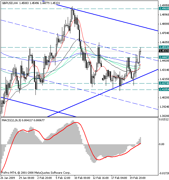 Британский фунт продолжает торговаться в рамках среднесрочного нисходящего торгового коридора, но в то же время третий день подряд можно наблюдать высокую активность быков. Поддержку британской валюте оказали важные фундаментальные данные, вышедшие в пятницу, согласно которых розничные продажи в Великобритании выросли в январе на 0.7%. На фоне сокращения числа рабочих мест, темпами не виданных с 1990х годов и сокращения оборотов промышленности на 6.5%, статистику отражающую прирост объема продаж на 1,5% за последний квартал рынок воспринял позитивно. Так на торгах в пятницу был повторно протестирован сильный уровень сопротивления 1.4440/50 и уже сегодня на азиатской сессии этот уровень был пробит, после чего британский фунт продолжил стремительно укрепляться и достиг очередного не менее сильного уровня 1.4550 пробой которого может привести к появлению агрессивных покупателей британской валюты и открыть путь быкам к уровню 1.5000.