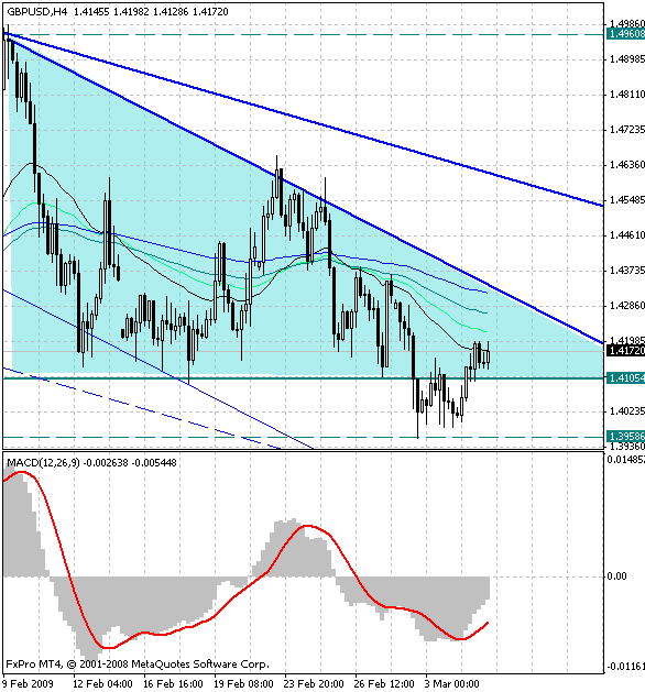 На 4х часовом графике можно наблюдать, как курс валюты вернулся в ранее сформированный нисходящий треугольник и предпринимает попытки дальнейшего роста. Ближайший уровень, который сдерживает восходящее движение - 1.4200, при его пробое можно будет ожидать дальнейший рост британской валюты к уровням 1.4270 и 1.4320. MACD так же указывает на возможный рост фунта.