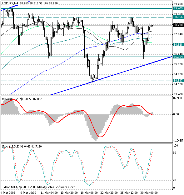 На 4х часовом графике по-прежнему сохраняется среднесрочный восходящий торговый коридор, а курс валюты торгуется в рамках сформированного внутри его ценового диапазона 96.00-99.40.