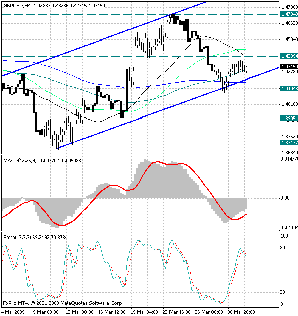 На дневном графике сохраняется нисходящий треугольник, в рамках которого проходят торги с декабря прошлого года. Торги в понедельник закрылись белой свечой с небольшим телом, что указывает на появление на рынке слабо выраженных бычьих настроений, но в то же время гистограмма MACD подает противоположный сигнал, поскольку находится в положительной зоне, но расположена ниже своей сигнальной линии и медленно снижается. В данный момент курс валюты тестирует 50 дневную скользящую среднюю, которая является сильным уровнями сопротивления 1.4340/50. Этот уровень по праву можно назвать ключевым, поскольку в случае его пробоя могут начаться агрессивные покупки британской валюты.