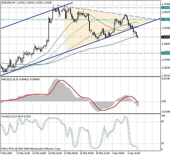 На 4х часовом графике можно наблюдать, как вчера во второй половине дня медведями удалось пробить нижнюю границу краткосрочного восходящего торгового коридора, что привело усилению медвежьих настроений на рынке. С фундаментальной точки зрения на ослабление евро повлияли новости о том, что ВВП Еврозоны по итогам четвертого квартала сократился на 1,6%, а не на 1,5% как сообщалось ранее.Такое снижение стало самым большим, по крайней мере за последние 13 лет.
