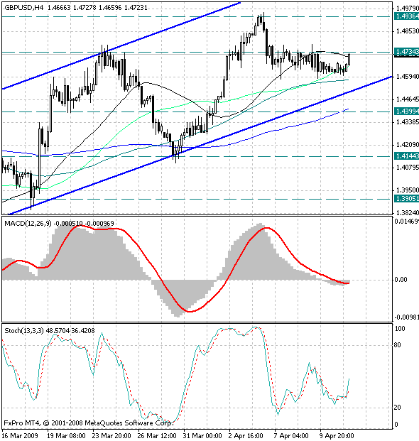На 4х часовом графике сохраняется краткосрочный восходящий торговый коридор.GBP/USD Скользящие средние 55, 89 и 144 по-прежнему направлены вверх и указывают на сохраняющиеся бычьи настроения в краткосрочной перспективе. Гистограмма MACD пытается выйти из отрицательной зоны и сформировать сигнал на покупку британской валюты . Осциллятор стохастик так же указывает на возможный рост фунта, поскольку поскольку в данный момент линия %K поднимается выше линии %D. Но поскольку сегодня практически во всех странах праздник - Пасхальный понедельник, то активность на рынке может быть крайне низкой. Поэтому в данный момент до прояснения ситуации (в виде выхода курса валюты из диапазона 1.4600-1.4800) трейдерам лучше всего остаться вне рынка. Уровни сопротивления : 1.4740, 1.4770, 1.4800/10, 1.4850, 1.4875, 1.4900 Текущая цена : 1.4723 Уровни поддержки : 1/4700, 1.4670, 1.4650, 1.4625, 1.4600, 1.4575, 1.4550, 1.4530, 1.4500