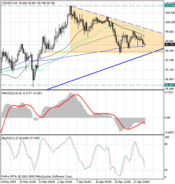 В данный момент курс валюты вплотную приблизился к уровню поддержки 98.60, которым является скользящая средняя с периодом 144. Напомним, что данный уровень уже тестировался в прошлый четверг, но так и не был пробит, что придает ему большую значимость.