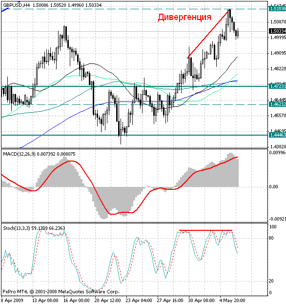 Вчера мы предполагали, что рост британского фунта может замедлиться возле уровня сопротивления 1.5060, будет сформирована графическая разворотная модель "двойная вершина" и начнется коррекция, но неожиданно резкое улучшение индекса PMI в строительной сфере Великобритании привело к усилению бычьих настроений на рынке форекс и уровень 1.5060 был с легкостью пробит. Всего за несколько часов фунт укрепился по отношению к американскому доллару более чем на 100 пунктов и достиг четырехмесячных максимумов. С началом торгов в Америке трейдеры начали фиксировать свою прибыль по краткосрочным ордерам на покупку, что разумеется привело к коррекции и британский фунт начал постепенно терять ранее завоеванные позиции. С технической точки зрения причиной фиксации прибыли стала дивергенция, сформированная осциллятором стохастик.