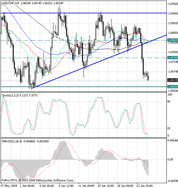 В начале европейской сессии вторника курс валюты смог пробить сильный уровень поддержки 1.0800, а так же нижнюю границу ранее сформированного восходящего треугольника, что привело к усилению медвежьих настроений на рынке форекс и дальнейшему снижению котировок в область четырехнедельных минимумов. Как мы уже отмечали вчера, что с точки зрения фундаментального анализа швейцарская валюта получила поддержку за счет хороших новостей - профицит торгового баланса Швейцарии оказался в мае лучше средних рыночных ожиданий, составив 2,013 млрд,в то время как предполагалось его снижение до 1,86 с 2,55 месяцем ранее.