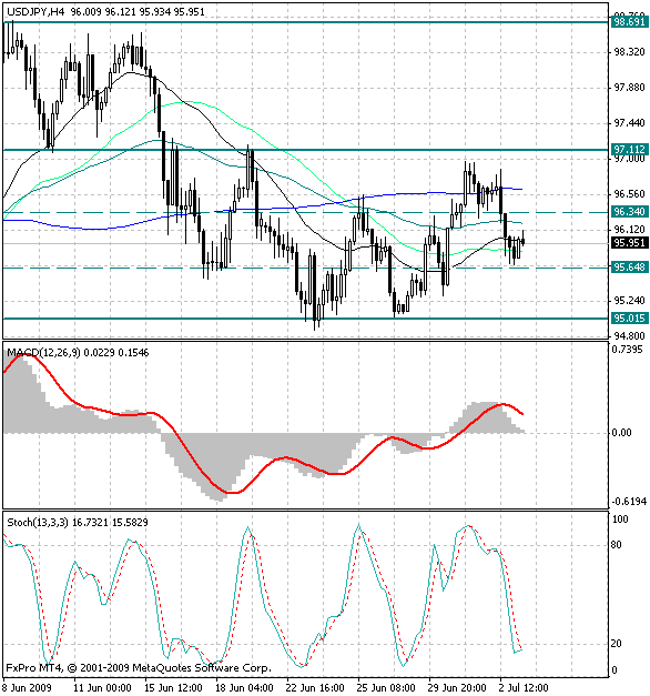 В первой половине дня четверга быкам так и не удалось пробить сильный уровень сопротивления 97 йен за доллар. Практически сразу после начала торгов в Америке начались агрессивные продажи доллар/йены, вызванные негативными фундаментальными данными для США: - число рабочих мест вне сельского хозяйства сократилось на 467 тыс. в июне - уровень безработицы вырос до 9,5% В итоге продажи продолжались практически до конца торгового дня и лишь возле уровня поддержки 95.75 нисходящее движение замедлилось. С тех пор курс валюты консолидируется в диапазоне 95.75-96.10.