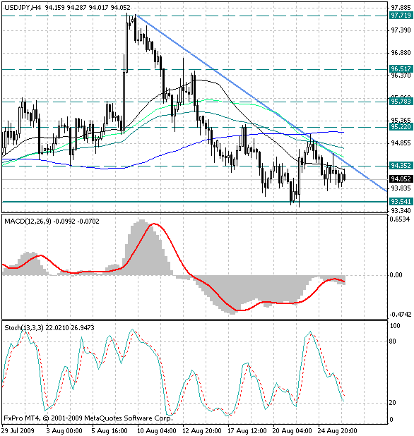 Текущий уровень цен расположен ниже скользящих средних с периодами 34, 55, 89 и 144, которые являются ближайшими сильными уровнями сопротивления 94.30, 94.80 и 95.00.