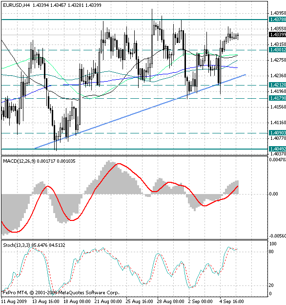 Как мы и ожидали вчера, в начале европейской сессии понедельника рост евро/доллара продолжился и котировки вплотную приблизились к локальному максимуму 1.4375/1.4400. Но уже возле уровня 1.4360 рост евро замедлился и четвертую торговую сессию подряд курс валюты консолидируется в рамках ценового диапазона 1.4330-1.4360. Причина низкой волатильности на рынке форекс - отсутствие важных фундаментальных данных из Еврозоны, а так же праздник в США.
