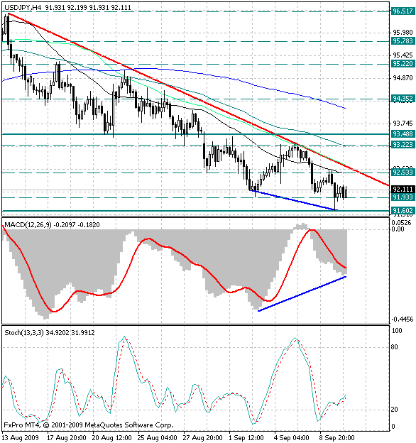 На торах в среду курс валюты так и не смог пробить сильный уровень сопротивления 92.50/60, после чего продажи доллар/йены возобновились и на в начале американской сессии котировки достигли уровня 91.60. Уже возле уровня 91.60 нисходящее движение замедлилось и третью сессию подряд курс валюты консолидируется в диапазоне 91.70-92.20.