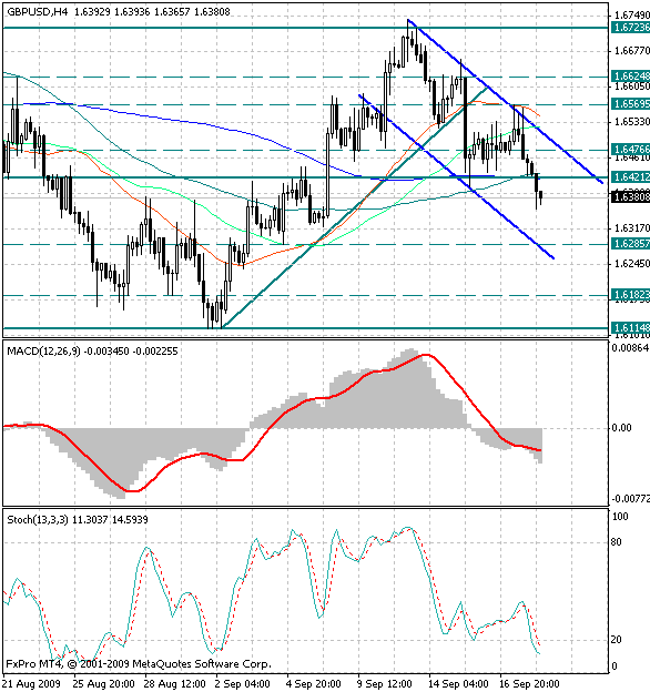 Сейчас на 4х часовом графике хорошо видно, как курс валюты закрепился ниже сильного уровня 1.6420 и нисходящее движение не имеет видимых преград вплоть до уровня 1.6280.
