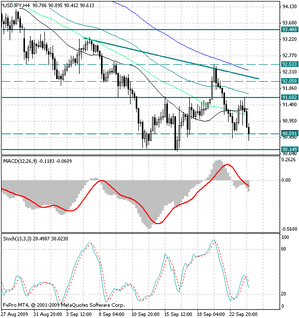 Обратив внимание на 4х часовой график, можно заметить, что курс валюты тестирует сильный уровень поддержки 90.60, который сдерживает котировки от дальнейшего падения в область локальных минимумов.