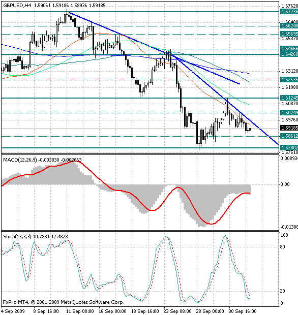 Обратив внимание на 4х часовой график, можно заметить, что британская валюта по прежнему испытывает на себе давление со стороны медведей и их краткосрочная цель остается прежней - локальный минимум 1.5780.