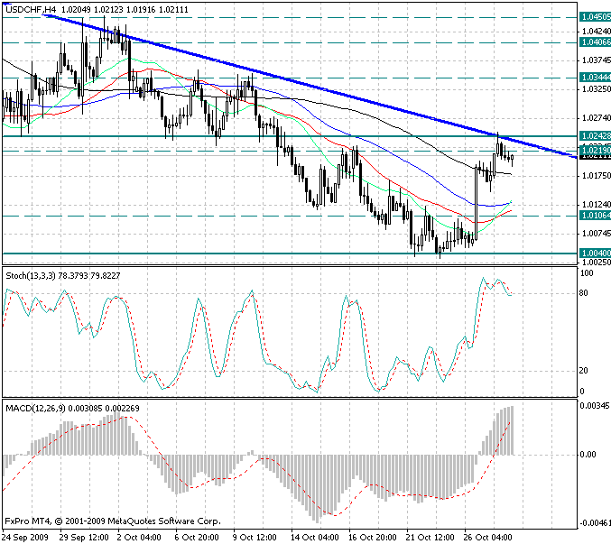 Обратив внимание на 4х часовой график, можно заметить, что на европейской сессии вторника американский доллар продолжил укрепляться по отношению к швейцарскому франку и уже на американской сессии курс валюты дважды протестировал сильный уровень сопротивления 1.0250. С точки зрения фундаментального анализа, давление на франк оказала новость о том, что индекс потребительской активности Швейцарии, рассчитываемый UBS, снизился в сентябре.