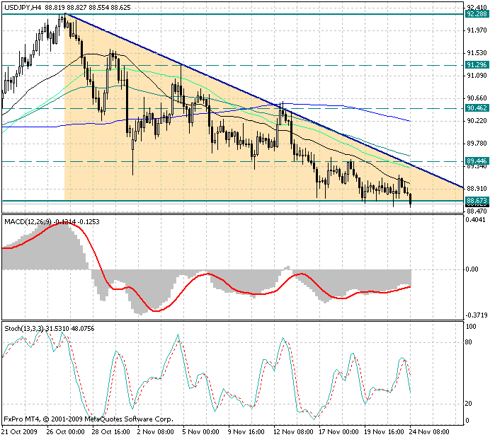 На этом же графике, хорошо видно, что на рынок форекс вернулись агрессивные продавцы доллар/йены и в данный момент курс валюты тестирует нижнюю границу треугольника, которая является сильным уровнем поддержки 88.70/60.