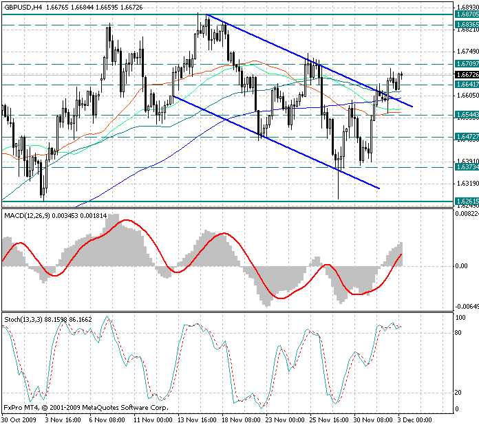 Поскольку доверять лишь одном четкому сигналу явно рискованно, то в качестве подтверждения того, что на рынке форекс по данной валютной паре вновь могут усилиться бычьи настроения, нам необходимо дождаться пробоя уровня сопротивления 1.6700, который может открыть путь к уровням 1.6750, 1.6800/30 и 1.6870 (локальный максимум).