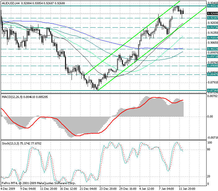 Обратив внимание на 4х часовой график, можно заметить, что вчера, так же как и 25 ноября и 3 декабря 2009 года курс валюты не смог пробить сильный уровень сопротивления 0.9325, после чего началась коррекция, которая продолжается до сих пор...