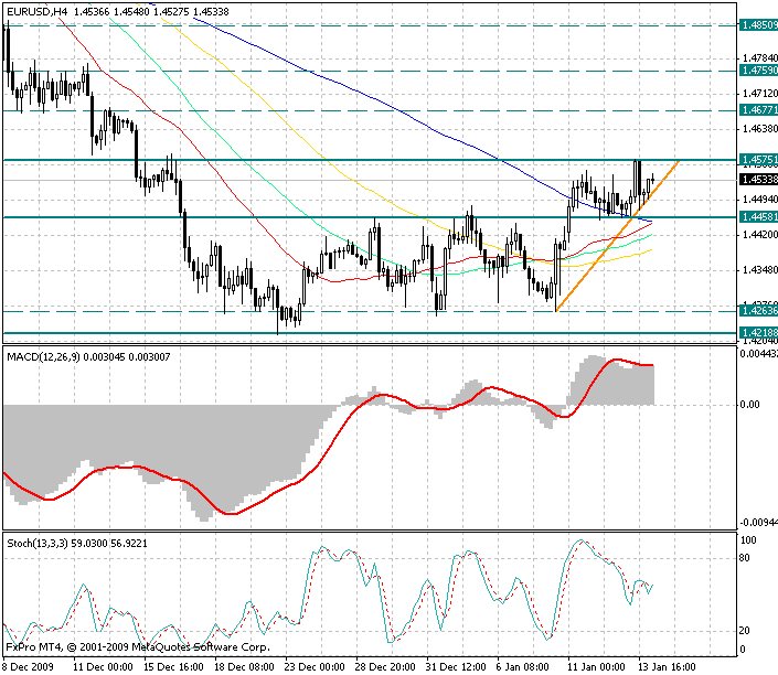1. Пробой уровня сопротивления 1.4575 и рост евро к уровням 1.4640 и 1.4700.