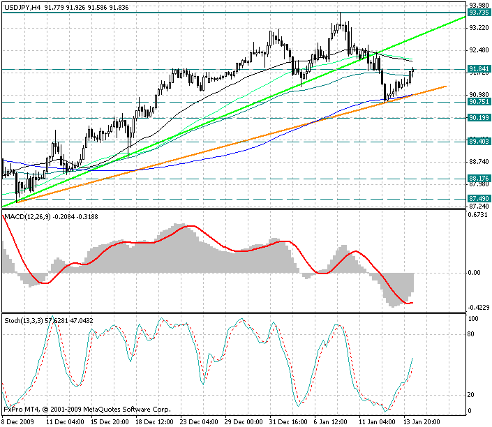 Обратив внимание на 4х часовой график, можно заметить, что второй день подряд американский доллар продолжает медленно укрепляться по отношению к японской йене после коррекции к уровню 90.75...