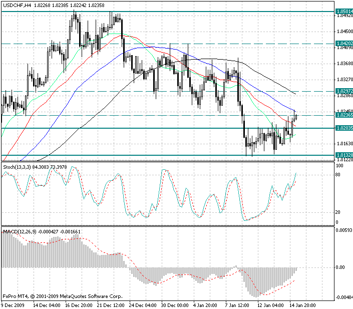 Гистограмма MACD расположена в отрицательной зоне, но выше своей сигнальной линии, продолжает повышаться и тем самым подает сигнал на покупку доллар/франка.