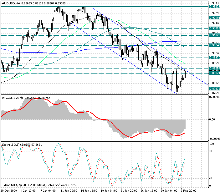 Обратив внимание на 4х часовой график, можно заметить, что на торгах во вторник курс валюты так и не смог пробить локальный минимум 0.8790/80, после чего началась коррекция, которая продолжается до сих пор...