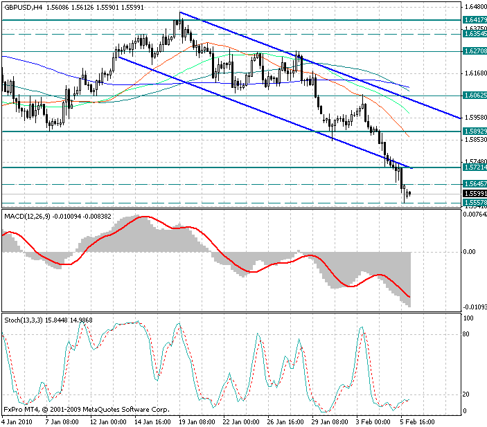 Обратив внимание на 4х часовой график, можно заметить, что пробой уровня поддержки 1.5720/00 вновь привел к усилению медвежьих настроений и "отработка" ранее намеченной цели 1.5630/00 завершилась в начале американской сессии прошлой пятницы. Нисходящее движение замедлилось лишь возле уровня 1.5560, после чего началась консолидация в диапазоне 1.5560-1.5650, которая продолжается до сих пор...