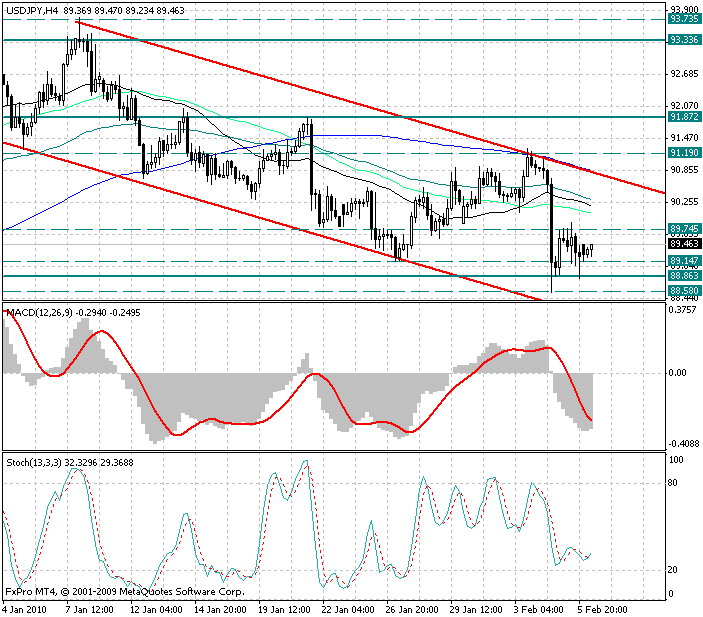 Обратив внимание на 4х часовой график, можно заметить, что ярко выраженный нисходящий тренд сохраняется, но в то же время уже третий торговый день подряд курс валюты продолжает консолидироваться в диапазоне 88.80-89.75. Это в свою очередь сигнал о том, что на рынке форекс по данной валютной паре сохраняется краткосрочная неопределенность...