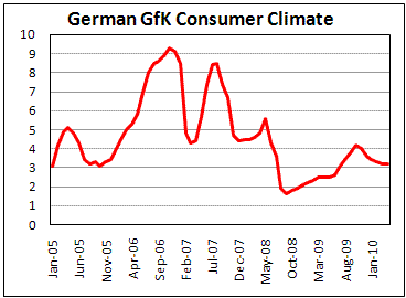 На этом фоне неплохо чувствуют себя немцы. Как показал отчет GfK, индекс потребительского климата составил к началу апреля 3,2 пункта, как и месяцем ранее, в то время как предполагалось в среднем его минимальное снижение. На этом фоне выглядят обоснованными нападки на Меркель, что Германия извлекает из страданий остальной Европы прибыль, наращивая экспорт. Сегодня был предварительный саммит глав стран еврозоны, созванный для того, чтобы выработать общую позицию в отношении Греции, выступая на нем, Меркель сказала, что евро выглядит сильнее, чем когда-то дойч-марка. Интересно, она так на самом деле сейчас думает после 19 фигур, потерянных менее чем за четыре месяца на беспокойствах, что Греция не сумеет рефинансировать долги? В любом случае, за последние несколько дней позиция Германии заметно ужесточилась: помощь от стран еврозоны возможна только в виде последней инстанции и при обязательном участии МВФ.