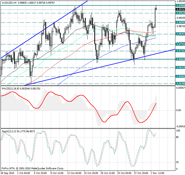 Обратив внимание на 4х часовой график, можно заметить, что примерно пол часа назад курс валюты достиг паритета (исторический максимум). С точки зрения фундаментального анализа, сильную поддержку австралийскому доллару оказала новость о том, что Резервный Банк Австралии принял решение повысить основную процентную ставку на 25 базисных пунктов до 4.75%, поскольку большинство аналитиков ожидало, что Банк сохранит ставку на прежнем уровне.